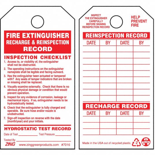 They are tagged the month they arrive into our inventory. Nov 20, 2020 · use this fire extinguisher template to record the fire extinguisher type, (abc, bc, a, d or k), check for inspection tags, seals, labels, and extinguisher validity. Pay attention to instances where a portable fire extinguisher may be behind furniture, office equipment, and doors, or hidden under office desks and sink cabinets. Fire extinguisher weight vs rating • the weight of the extinguisher is based on the amount of the extinguishing agent. When a fire extinguisher is obstructed, it could mean the difference between life and death. Congratulations, you have completed a monthly fire extinguisher inspection. Tags can be picked up at your local fire department or printed off the internet. If your extinguisher is missing or needs service, contact one of the following: Effective 4/26/2021, payments for tags and decals can now be made online on fdny business. A fire extinguisher is an active fire protection device used to extinguish or control small fires, often in emergency situations. This fire extinguisher comes with inspection tags already on it. Report expired service tags and missing, damaged, or used extinguishers immediately. • this if different than it's rating.